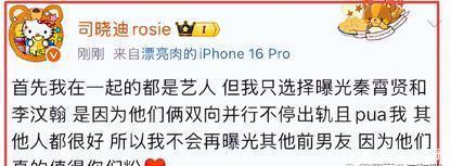 司晓迪呢,来自山东淄博,之前大家熟悉她,主要是因为她和秦霄贤、李汶翰之间的感情闹得挺热闹。她直言秦霄贤、李汶翰在跟她谈恋爱的时候,还一边和三四个女生往来,觉得不能让其他女生被骗,便打算把这些事全部揭露出来。